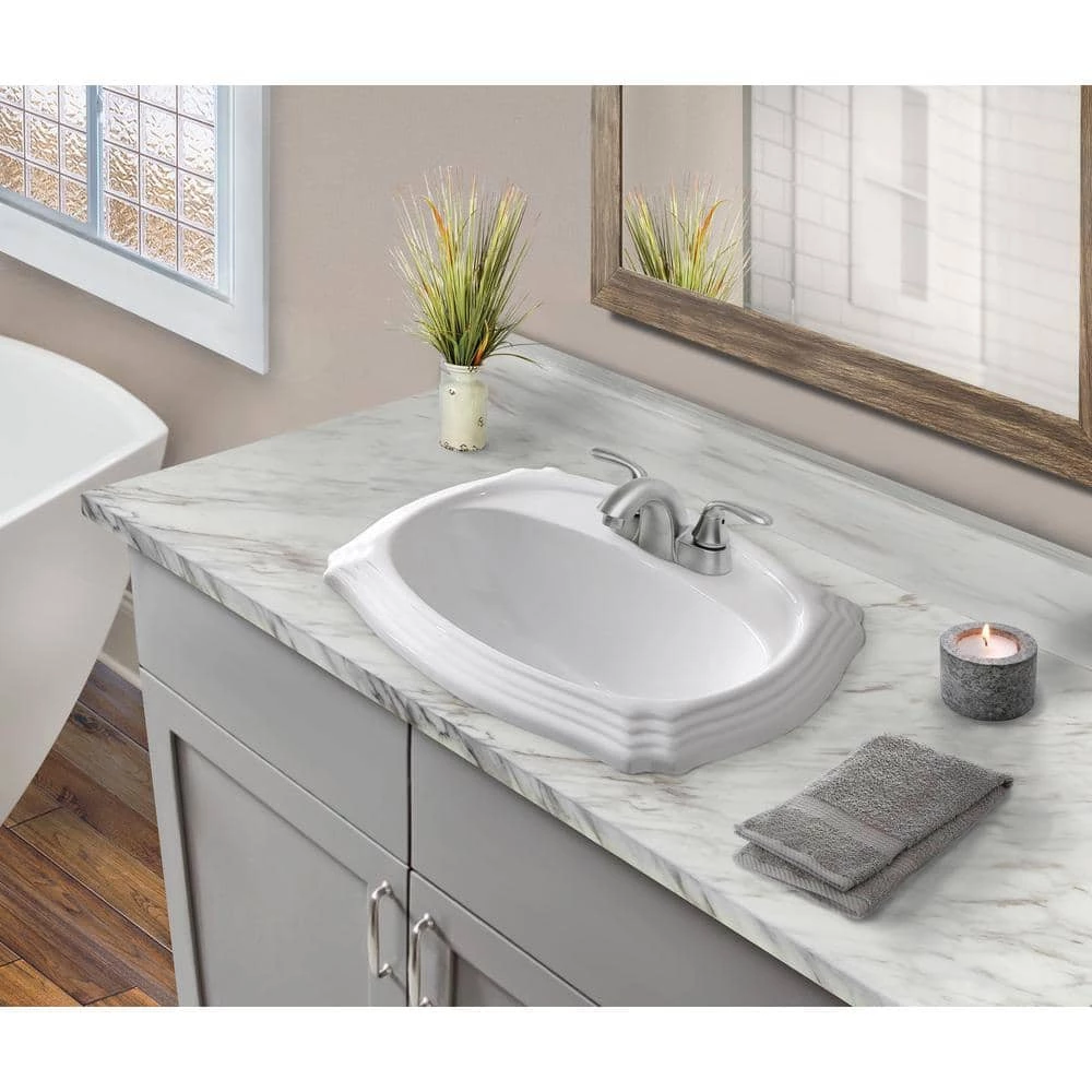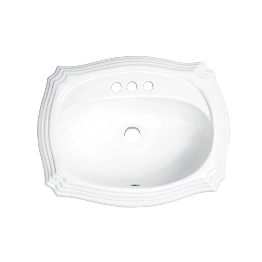 With an unparalleled glazed finish and smooth, chip-resistant surface, the understated elegance of this white ceramic sink is an integral component of any bathroom design. Installed above solid-surface countertops, the scalloped silhouette features a drop-in top-mount installation format and a feminine shape that’s perfect for the traditional master suite, guest bath or powder room. A gently beveled edge surrounds the oval porcelain basin with ornamental flourish. Available in white and constructed of durable vitreous china, the timeless sink design complements both traditional and contemporary bathroom decor. Maintain the lustrous finish by using gentle cleansers suitable for ceramic.