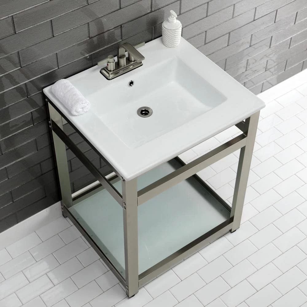 Exquisitely styled for your contemporary taste, this console sink will enhance your bathroom living space. With a beautiful ceramic counter top, this console sink set is a long lasting, durable, and elegant addition to your bathroom. The Kingston Brass 25 in. ceramic console sink (4 in., 3-hole) features a wash basin and steel base that is available in a handful of finish options. Their pristine, stain-resistant surface and glistening finish make for a very sturdy fixture that is easily maintained. Additionally, this sink base comes with a glass shelf for added functionality and aesthetic appeal. Water supply kit, drain assembly, and the faucet are sold separately.
