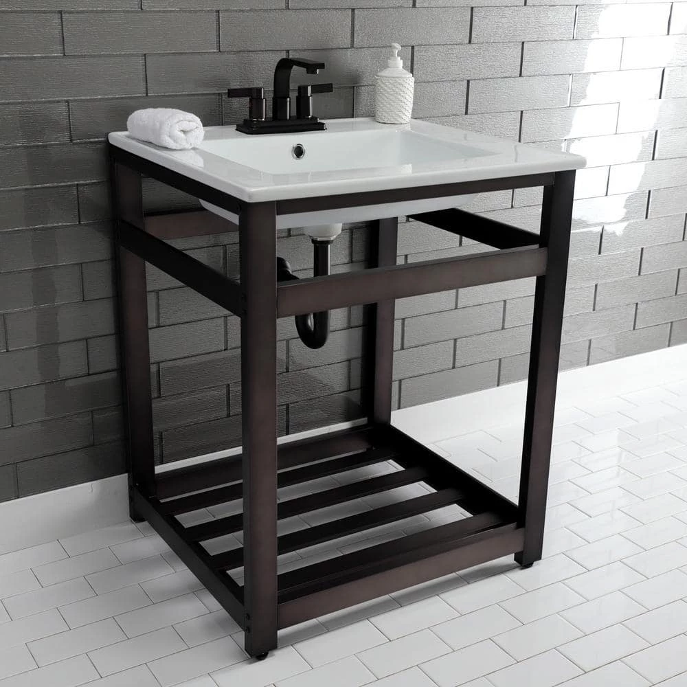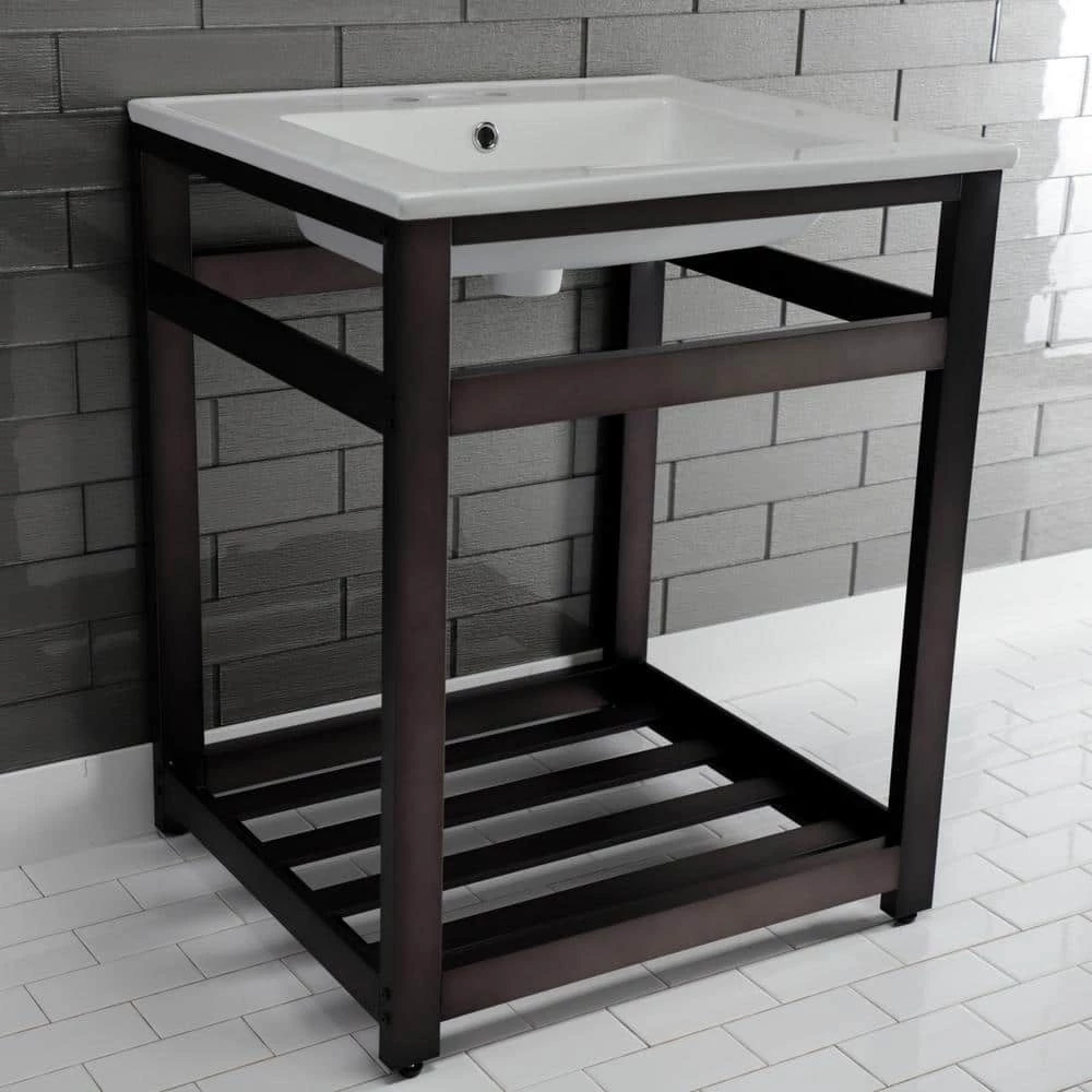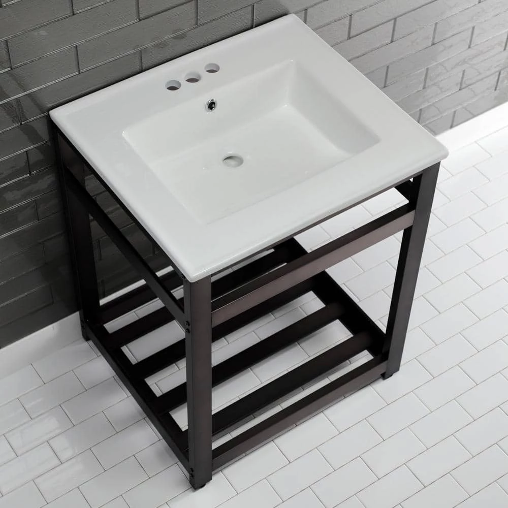 Exquisitely styled for your contemporary taste, this console sink will enhance your bathroom living space. With a beautiful ceramic counter top, this console sink set is a long lasting, durable, and elegant addition to your bathroom. The Kingston Brass 25 in. ceramic console sink (4 in., 3-hole) features a wash basin and steel base that is available in a handful of finish options. Their pristine, stain-resistant surface and glistening finish make for a very sturdy fixture that is easily maintained. Water supply kit, drain assembly, and the faucet are sold separately.