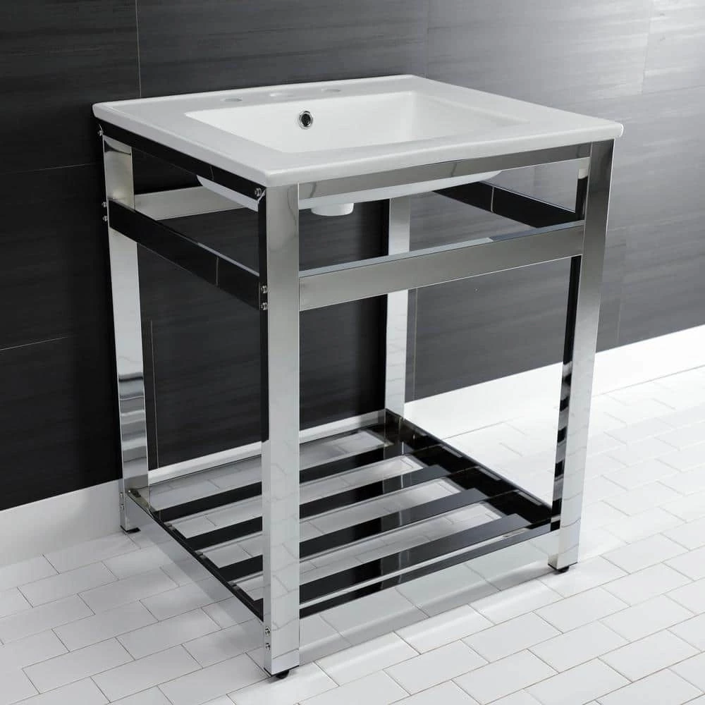Exquisitely styled for your contemporary taste, this console sink will enhance your bathroom living space. With a beautiful ceramic counter top, this console sink set is a long lasting, durable, and elegant addition to your bathroom. The Kingston Brass 25 in. ceramic console sink (8 in., 3-hole) features a wash basin and steel base that is available in a handful of finish options. Their pristine, stain-resistant surface and glistening finish make for a very sturdy fixture that is easily maintained. Water supply kit, drain assembly, and the faucet are sold separately.