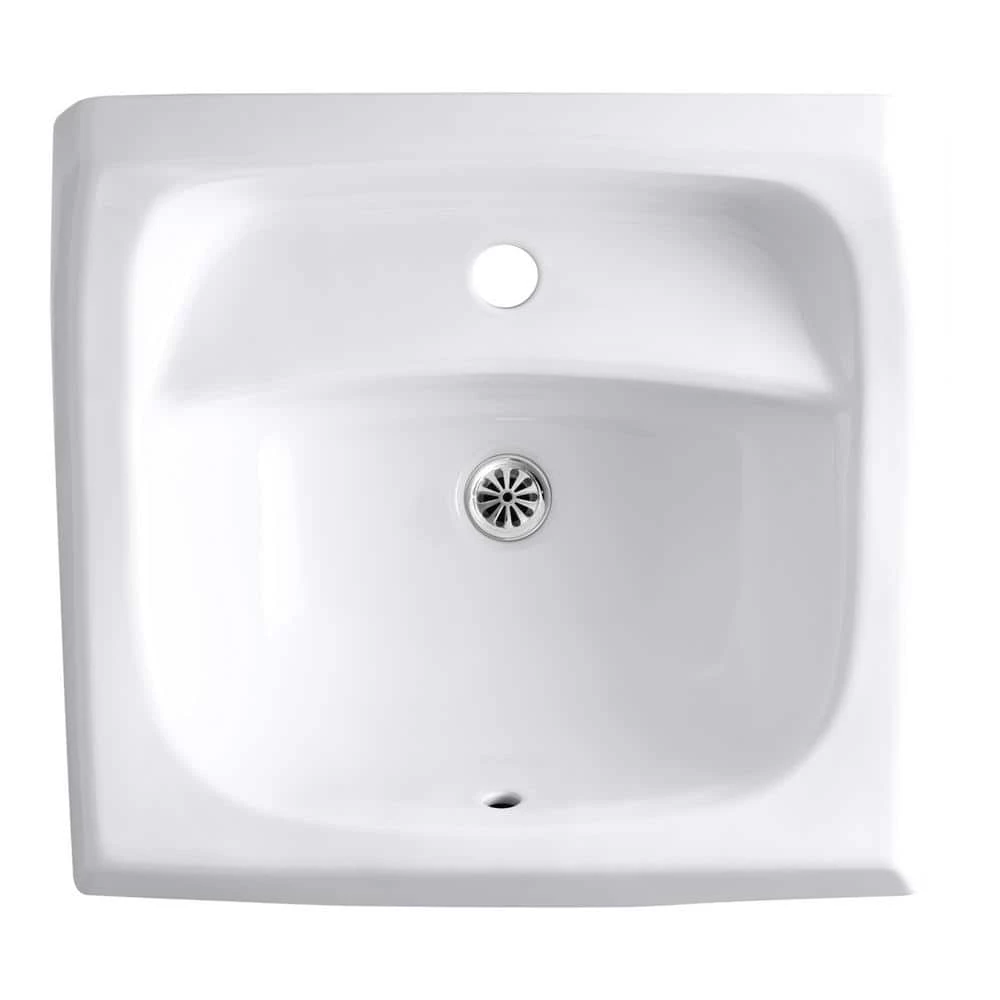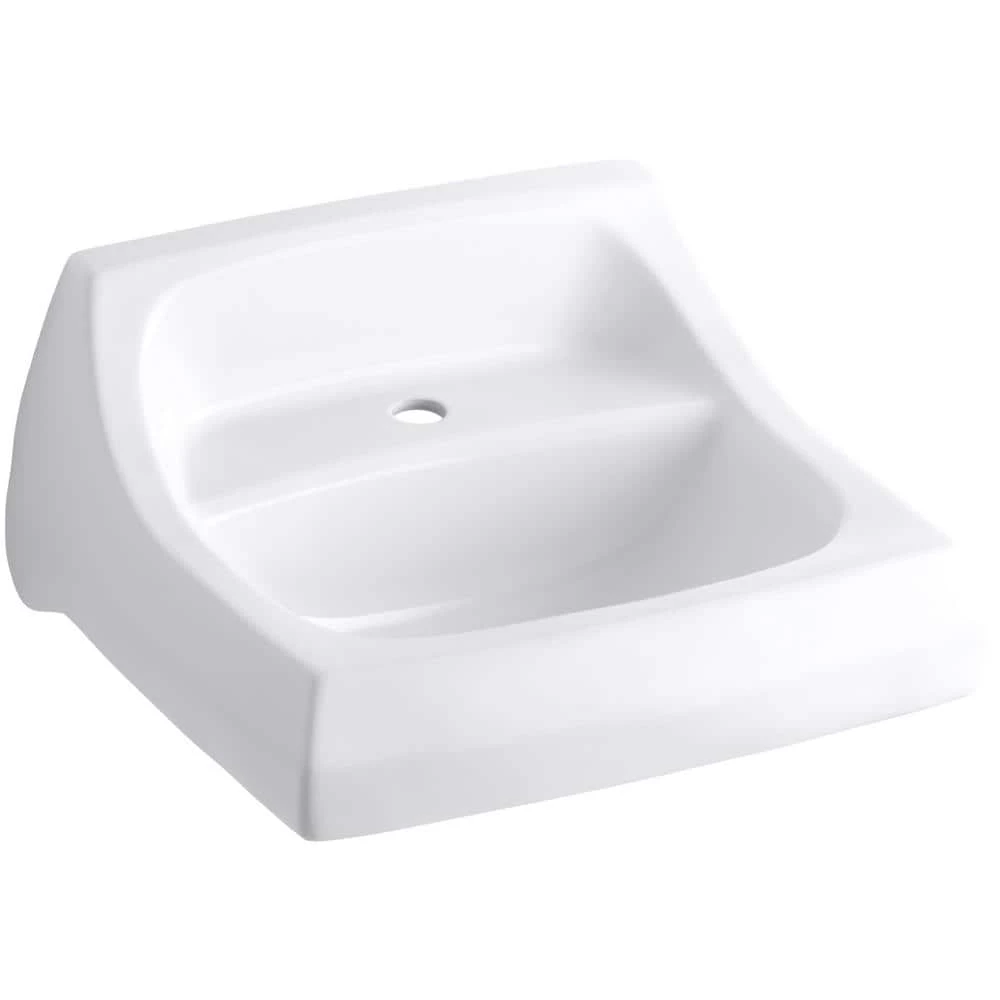 The KOHLER Kingston Wall-Mount Bathroom Sink in White is constructed of vitreous china for years of durable performance. This sink features ultra-thick enamel with a high-gloss finish to resist scratching and chipping, to maintain a lustrous sheen and to enable easy cleaning. Other features include drillings for a faucet with 4 in. centers and for a concealed arm carrier. A wall hanger is included.