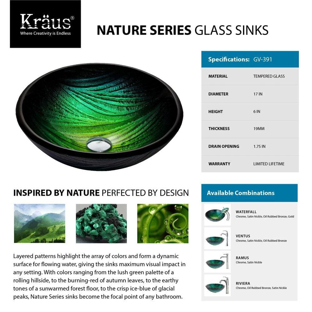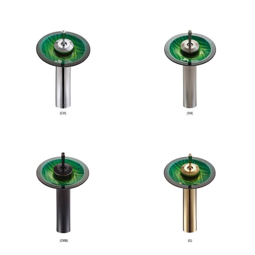 The KRAUS Nature Series reflects a move toward designs influenced by Earth’s elemental beauty. Handcrafted from tempered glass by skilled artisans, each of the vessel sinks is a functional work of art that complements the transitional and modern bathroom alike. A freestanding basin design creates a dramatic look with contemporary appeal. Inspired by the lush green palette of a rolling hillside, the Nei bathroom sink looks striking in a monochromatic setting or a clean, modern space. Vessel installation offers an easy top mount option for all your stylish bathroom ideas. Pair it with a waterfall faucet with matching glass disk for additional value, and create an instant style upgrade for less.
