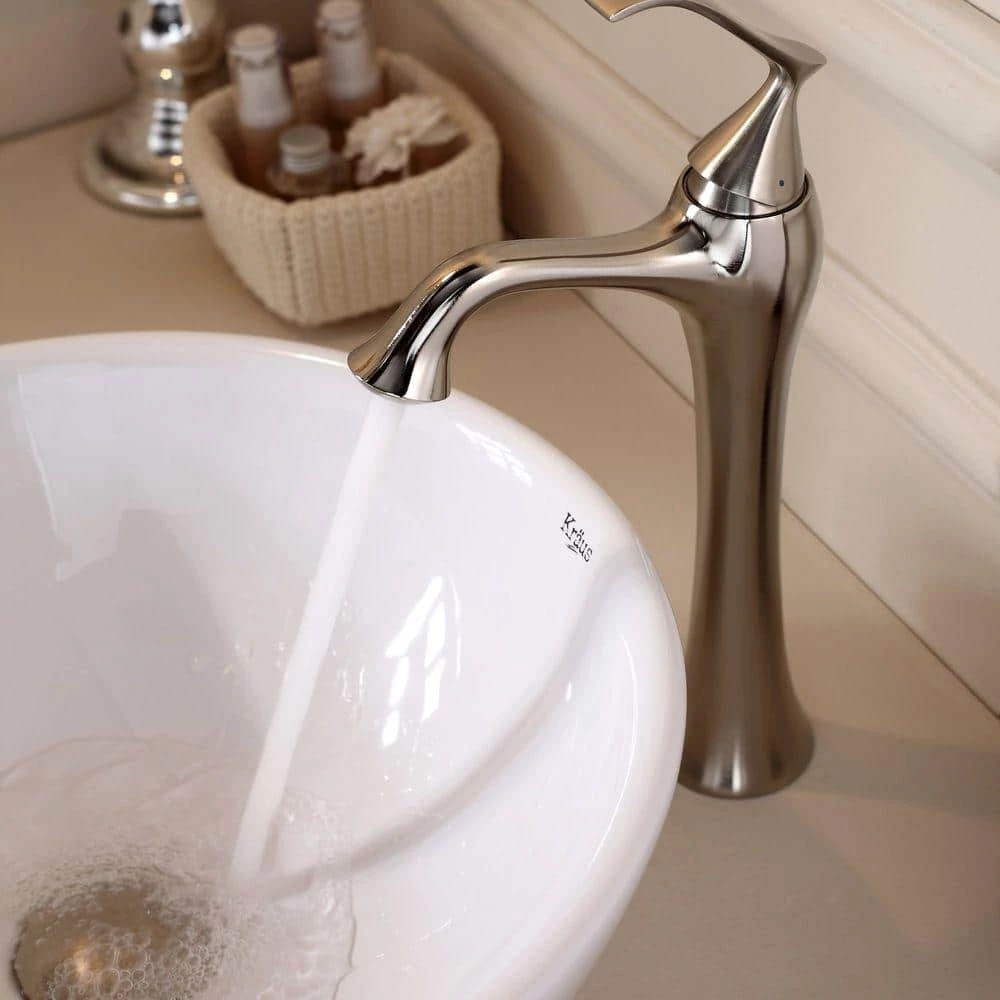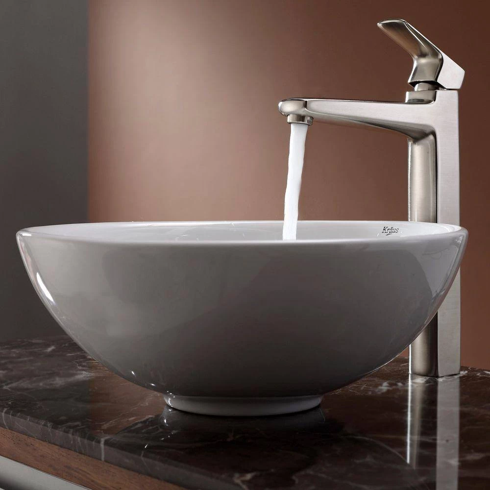 KRAUS Soft Round Ceramic Vessel Bathroom Sink in White with Pop Up Drain in Satin Nickel