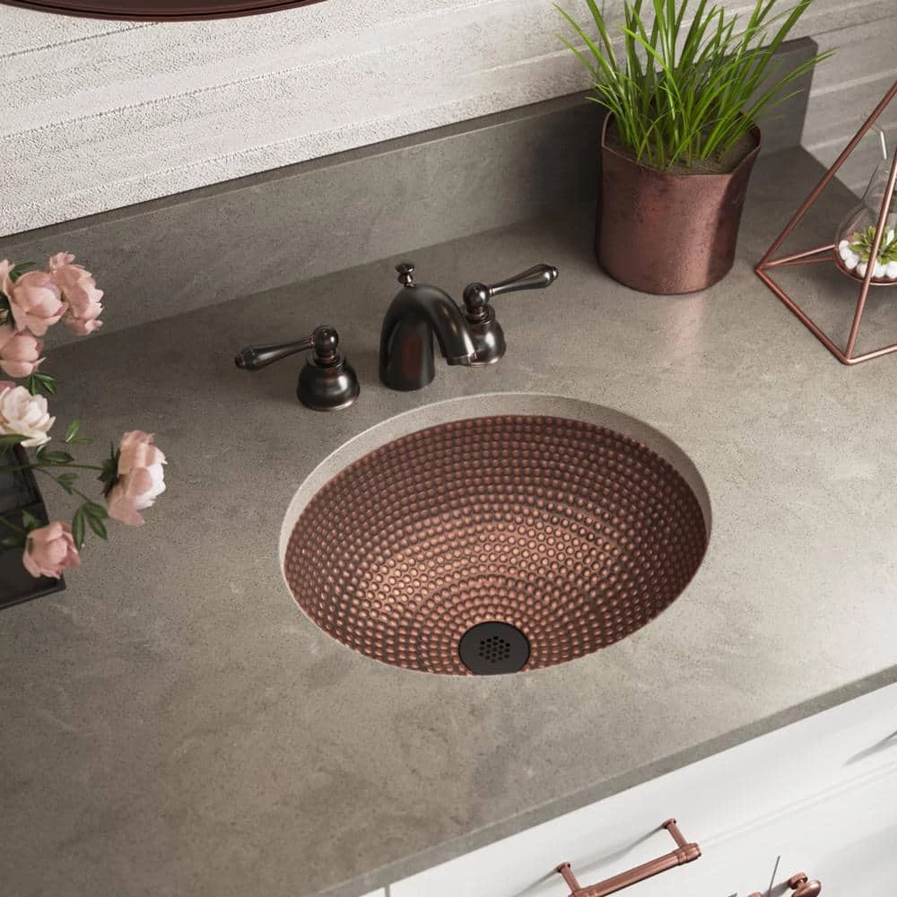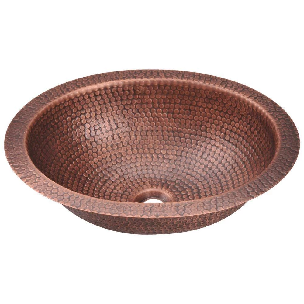 The 909 oval single bowl under mount or top mount sink is made from 99% pure-mined copper. It is comprised using 1-piece construction, giving you a very strong and durable copper sink. Since copper is naturally anti-bacterial and stain resistant, it is great for busy households that benefit from low-maintenance materials. The hammered finish looks great and provides a mask for small scratches that may appear over time. The overall dimensions of the 909 are 16-3/4 IN. x 13-3/4 in. x 5-1/2 in. with a centered drain and a required 18 in. minimum cabinet size. The hand-crafted copper details are sure to add warmth and richness to any decor.