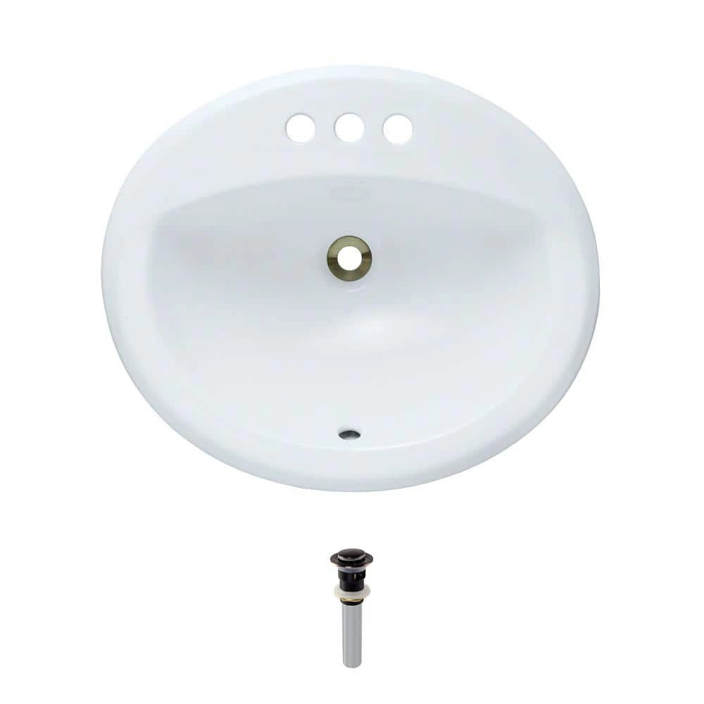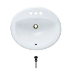 Overall, this bowl’s outer dimensions make it nearly circular, but the interior takes on a comfortable D-shape. Along the back rim, three pre-drilled holes provide for any style of faucet installation, and along the inner front curve is an overflow to prevent excessive filling. The additional vitreous china coating on this model creates an even more impervious and sanitary surface than standard porcelain. With an overall measurement of 20 in. x 18 in. x 8-1/2 in., it will require a minimum-width cabinet of 21 in. Additionally, a spring-loaded, pop-up drain (pud) is included, which opens and closes with a simple press to its attractive antique bronze cap.
