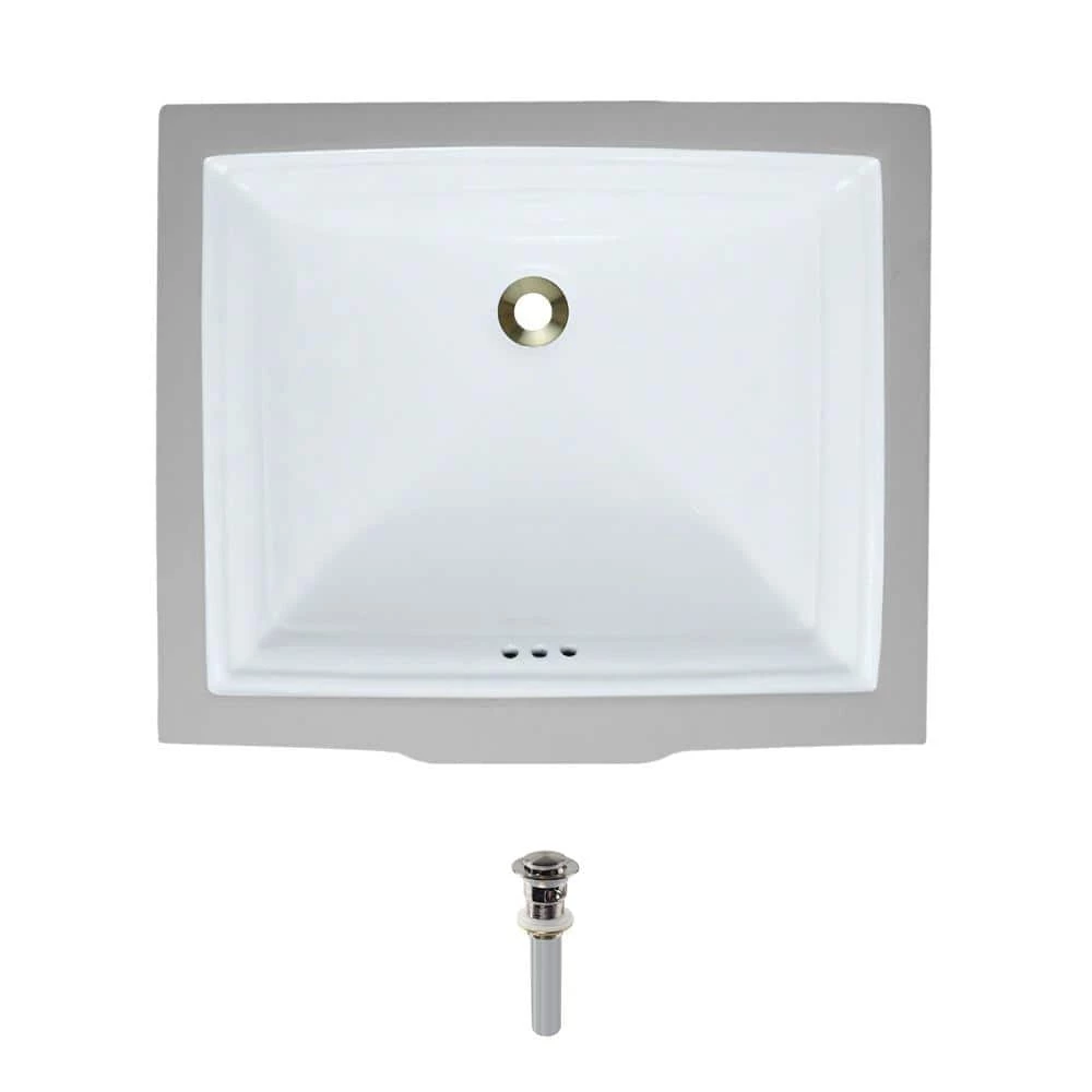 This under mount style sink features a straight back, and sides which gradually curve into its flat bottom. Durable and functional, it features three overflow holes hidden in the front panel to make it safe to fill with water. The additional vitreous china coating on this model creates an even more impervious and sanitary surface than standard porcelain. With an overall measurement of 21-1/2 in. x 18-3/8 in. x 9-1/8 in., it will require a minimum-width cabinet of 24 in. Additionally, a spring-loaded, pop-up drain (pud) is included, which opens and closes with a simple press to its attractive brushed nickel cap.