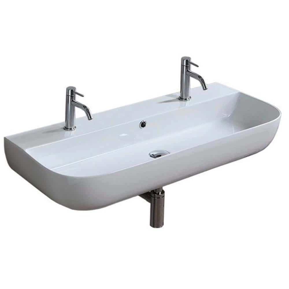 Perfect for the modern or contemporary bathroom atmosphere, this 37.5 inch bathroom sink is made from built-to-last white ceramic with an ultra thin edge. This sink can be used as a wall mounted sink or a vessel sink and features two pre-drilled faucet holes. Made in Italy by Scarabeo and part of the Glam collection.