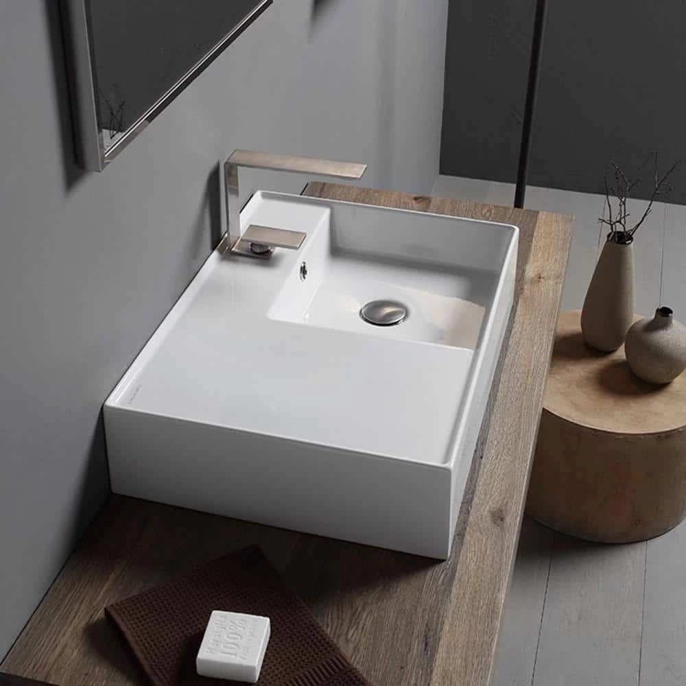 From the Italian designer Scarabeo, this white ceramic sink is part of the Teorema 2.0 collection. The sink comes in one hole option and equipped with plenty of counter space. It is functional as a wall mounted or vessel application and is perfect for the modern bathroom design.