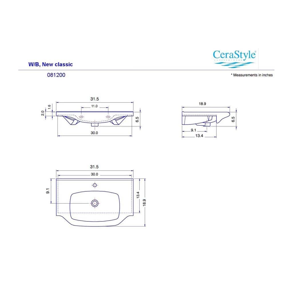 Classic-style 31.6 in. wall mounted or self-rimming bathroom sink with 1 pre-drilled faucet hole and included overflow. This beautiful sink is made out of high quality ceramic, and designed by high-end, and well known Turkish brand CeraStyle.
