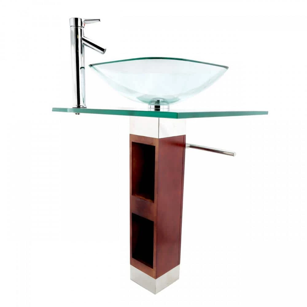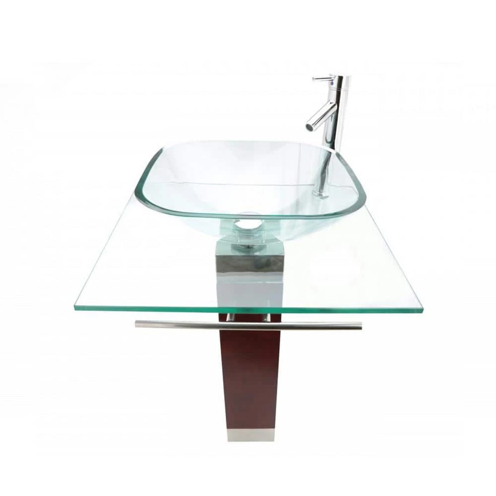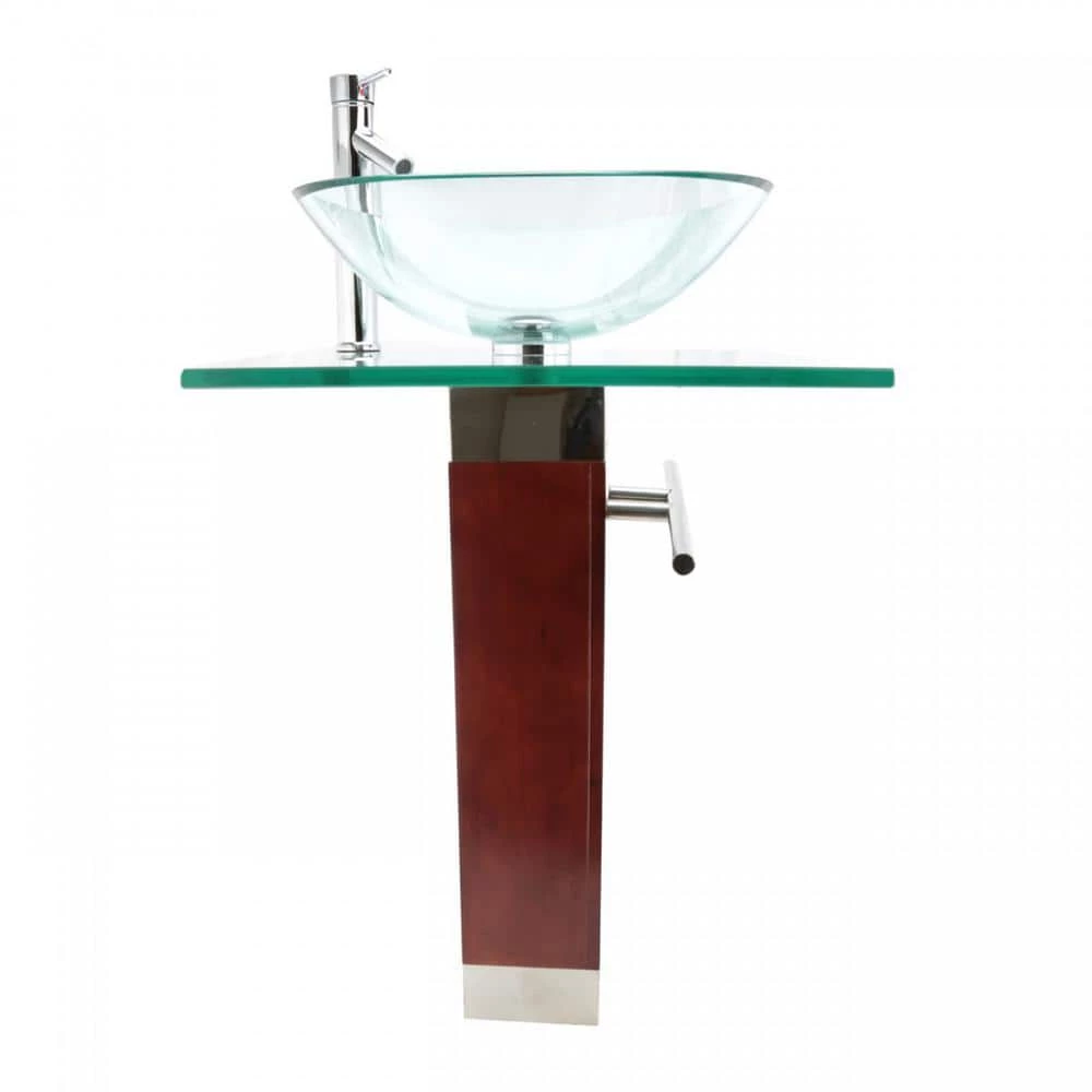 - Modern style Bohemia vessel sink is built using high quality glass material, combo pack includes a countertop round glass bowl, crystal clear tempered glass counter, dark reddish-brown oak wood pedestal, chrome faucet, upgraded popup sink drain and a stainless steel towel bar