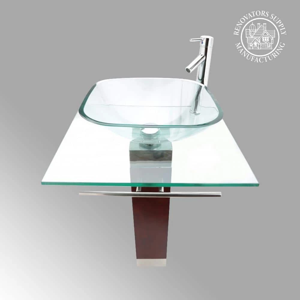 BOHEMIA MODERN TEMPERED GLASS PEDESTAL SINK COMBO. Add a touch of elegance to your bathroom with our modern and stylish tempered glass vessel sink combo. Its sleek design fits perfectly with any bathroom decor. This easy clean, smooth surface sink is manufactured of high strength tempered glass and leak proof ceramic cartridge. It is coupled with all chrome plated stainless steel hardware – Faucet, Pop Up Sink Drain and Towel Bar. FEATURESModern and Stylish Design Fit Perfectly with Any Bathroom DecorSmooth Glass Surface is Easy to Clean UpFaucet and Towel bar in Chrome Finish is Stain and rust ResistantLeak proof ceramic cartridge is used that is tested with 500000 cyclesMade of Resistant and solid high quality tempered glass materialP-traps to be bought separatelySPECIFICATIONMaterial = Tempered GlassColor = Crystal Clear GlassInstallation Method = PedestalSink Dimension = 16.37 x 5 InchesFaucet height = 12 InchesTowel bar = 19.5 InchesPedestal Length = 30 Inches x 6 InchesOverall = 43.13 Inches Height x 23.62 Inches Wide x 19.75 Inches Projection.BUILT WITH LOVERenovators Supply Bohemia pedestal sink is a modern look that brings a unique flair to any bathroom setting. All of these are carefully wrapped and packed separately to avoid any scratches during the transition. We offer you great value products for your money and a perfect way to spend wisely.