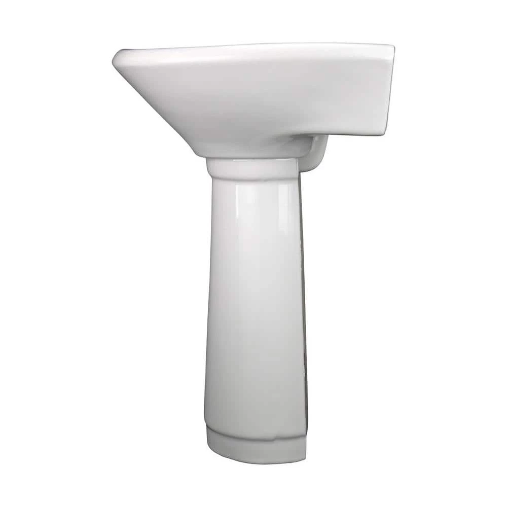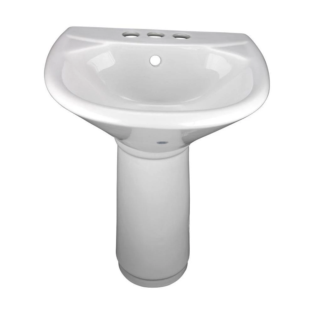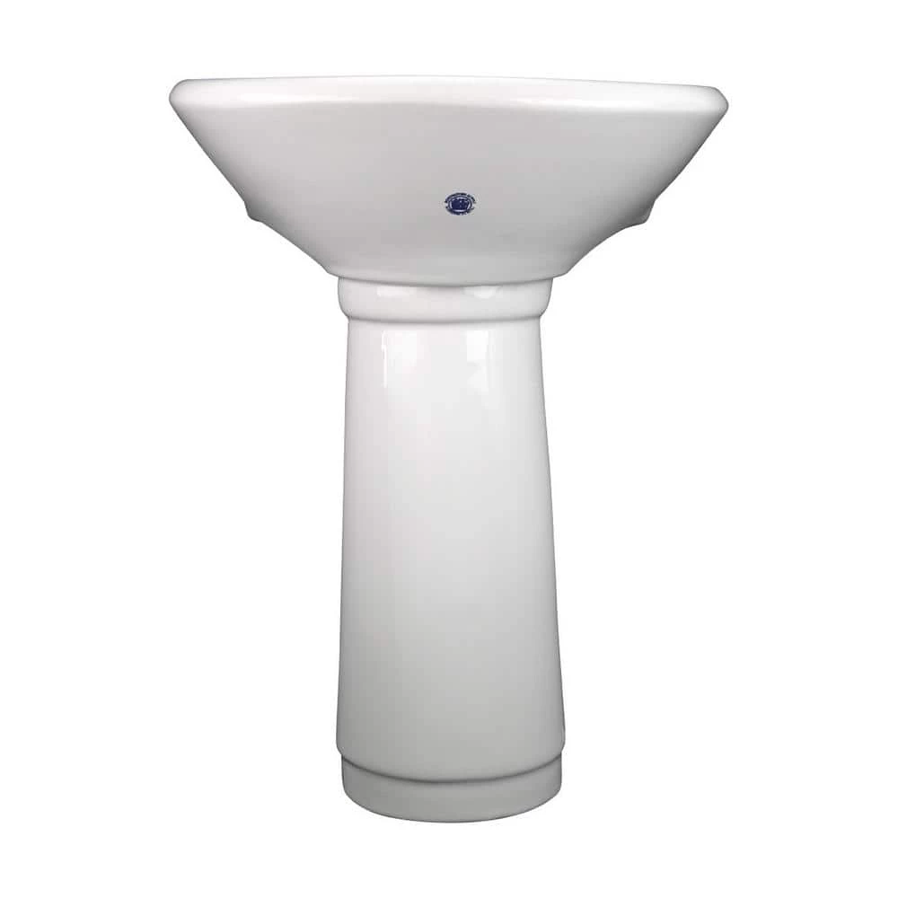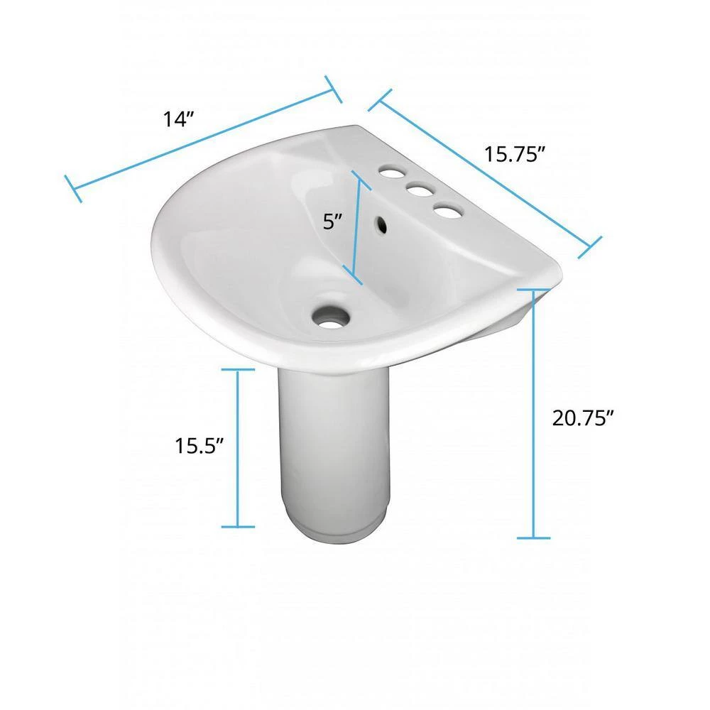 - DIMENSIONS – OVERALL WIDTH = 15.75 In., HEIGHT= 20.7.5 In., PROJECTION = 14 In., BASIN DEPTH = 5 In., PEDESTAL HEIGHT = 15.5 In., FAUCET HOLES = 3 Holes that accepts 4″ wide Centerset Faucets (not included).