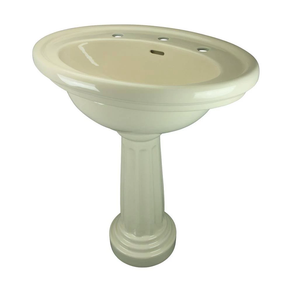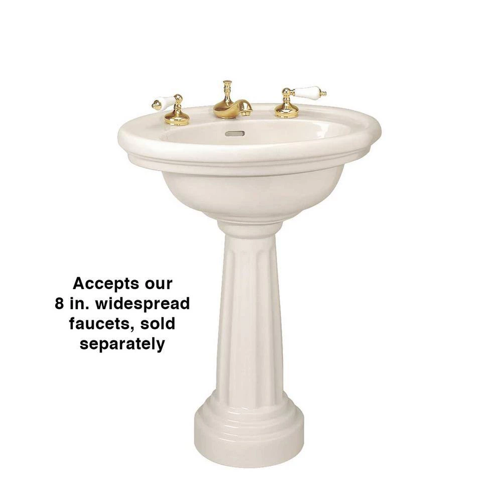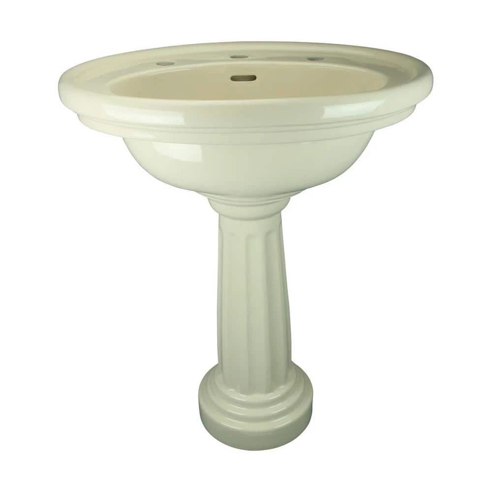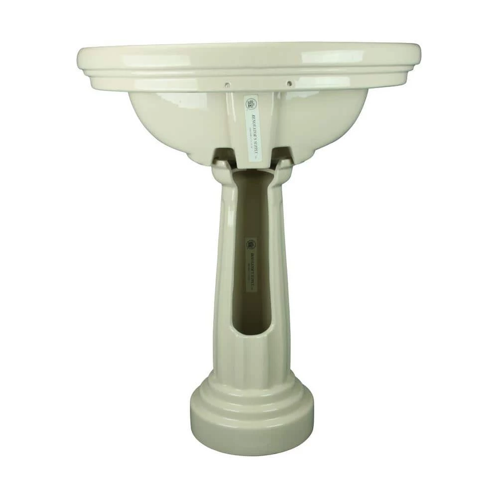 PHILADELPHIA BISCUIT GRADE A PORCELAIN PEDESTAL SINK The Classic Biscuit color Philadelphia pedestal sink from Renovators Supply Manufacturing features a luxurious wide top and bold design.FEATURES – This Traditional sink is a wide-top pedestal sink.- Open-back large pedestal sinks hide pipes and make installation a breeze.- Constructed from gorgeous Grade A vitreous china porcelain for durability and easy cleanup.- Reno-Gloss finish protects from scratches and stains.- Authentic Renovators Supply Manufacturing logo guarantees better quality than the knockoffs.- This bathroom pedestal sink is cUPC and ANSI Compliant- Freestanding installation style.- Convenient, large sinks and traditional bathroom design inspiration. OVERALL MEASUREMENTS – 32-1/4 In. Tall x 26-1/8 In.Wide x 19-3/8 In. Proj.,x 6-1/2 Deep. HARDWARE – Accepts an 8 In. widespread faucet (not included). – 1-3/4 In. drain hole (not included). PACK INCLUDES – One (1) Classic Philadelphia Porcelain Sink and Pedestal LegBUILT WITH LOVERenovators Supply Manufacturing Philadelphia Wall Mounted Oval Pedestal Sink is a mix of modern and traditional looks that brings a unique flair to any bathroom setting. All of these are carefully wrapped and packed separately to avoid any scratches during the transition – Buy with confidence!