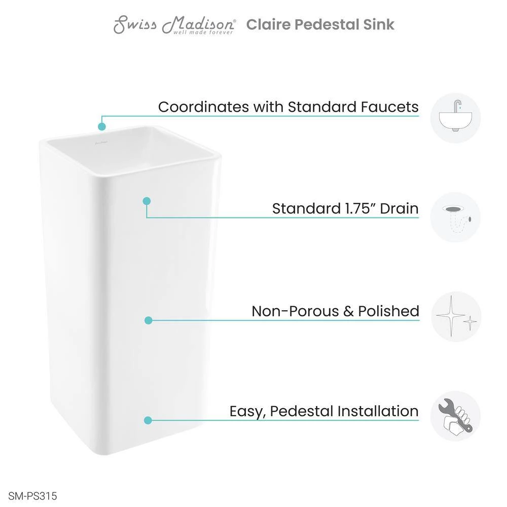 The Claire One-Piece Pedestal Sink features a modern design to help elevate any bathroom setting. The Claire’s simplistic silhouette is anything but basic, and its softly rounded edges perfectly contrasts its sharp design. This easy-to-clean sink is constructed of durable ceramic for longevity.