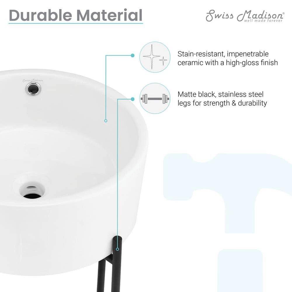 Monaco console sink is a complimentary selection for any bathroom. The 2-piece, freestanding design features a matte black stand with a circular basin and built-in singular faucet hole that offers a unique take on a classic style. Crafted from durable ceramic, the Monaco will not only look beautiful, but will remain so for many years.