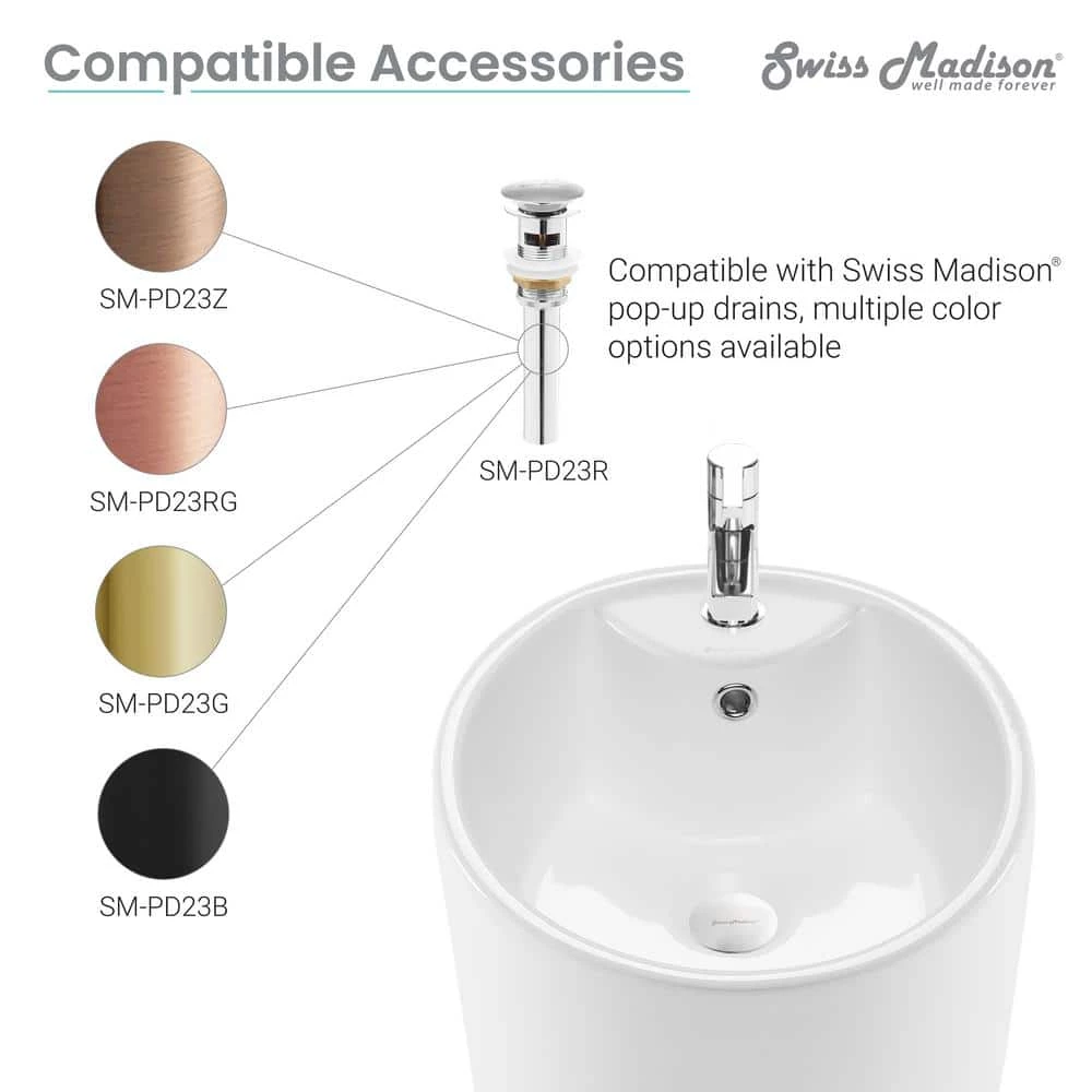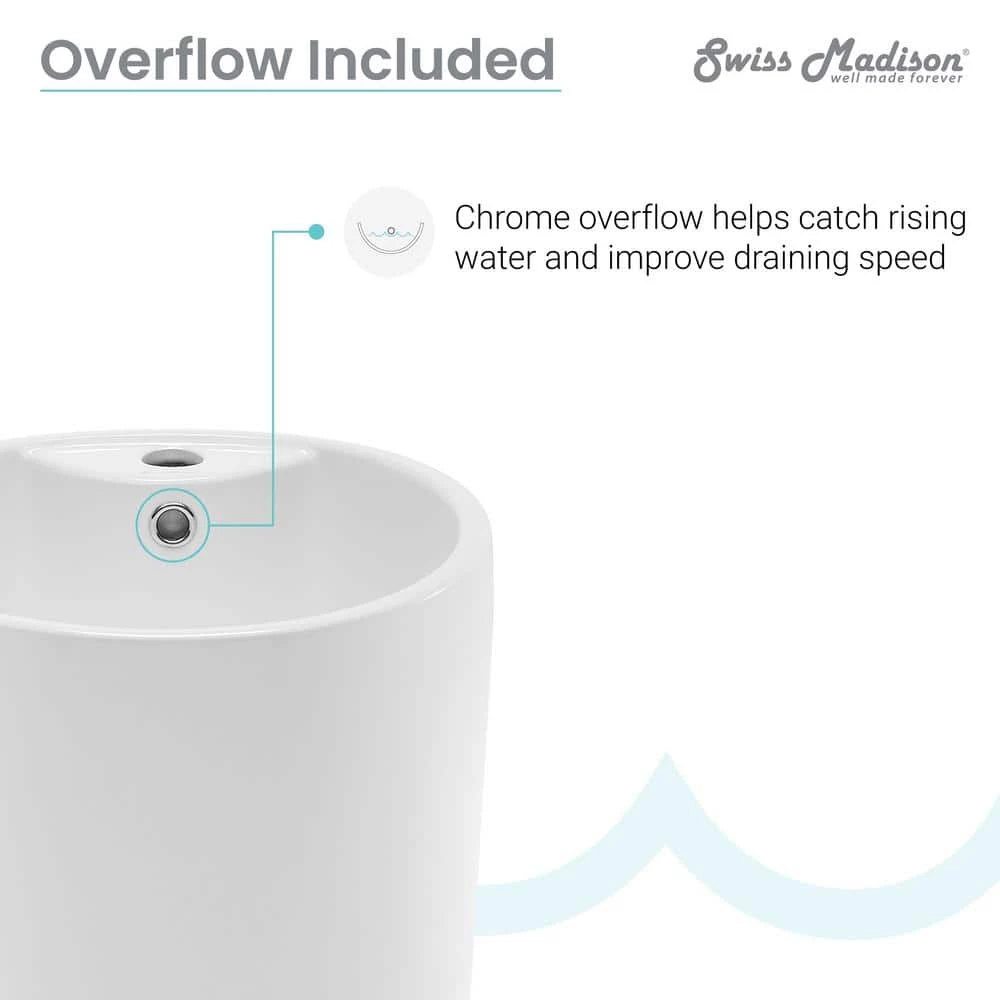 The solid freestanding one-piece design of Swiss Madison’s Monaco pedestal sink is a modern look that brings a unique flair to any bathroom setting. The sink is constructed of durable ceramic for a long-lasting fitting. It’s seamless finish provides a smooth surface for superior shine and easy cleaning.