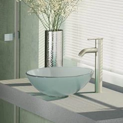 Rene Glass Vessel Sink in Frosted with R9-7001 Faucet and Pop-Up Drain in Brushed Nickel