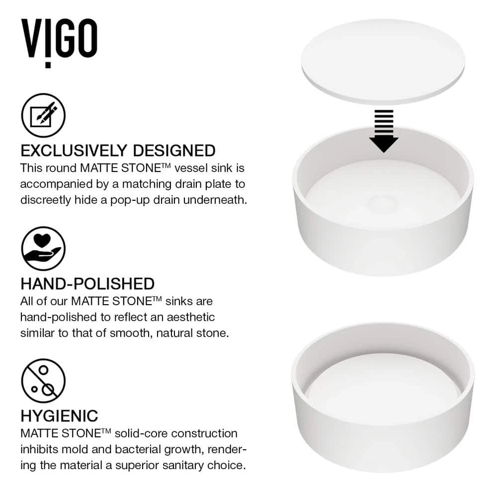 - MATTE STONE TM: VIGO’s proprietary solid core composite is smooth, non-porous and naturally hygienic that expertly resists scratches, fading, and impact
