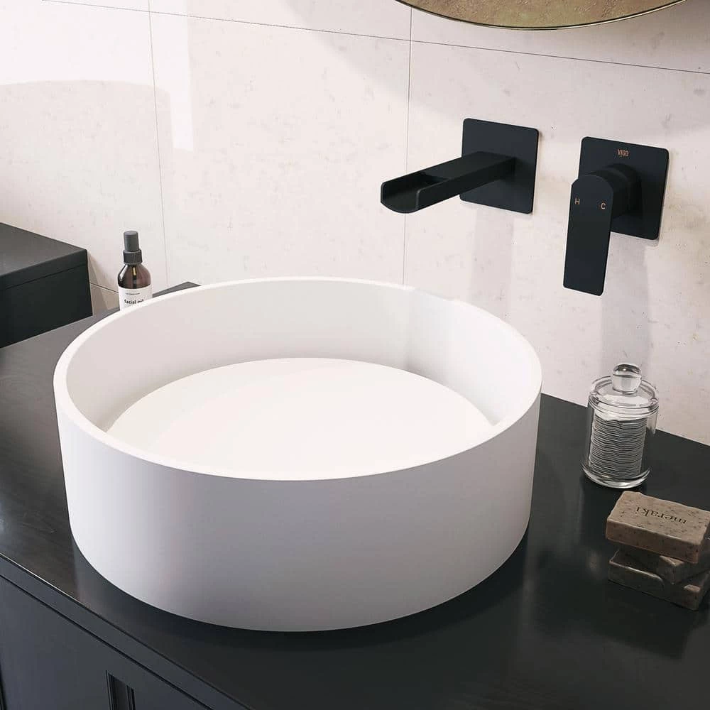 Make a statement with the VIGO Anvil Matte Stone Vessel Bathroom Sink. Made from solid core composite this hand-polished sink provides unparalleled strength and resistance to impact. VIGO’s proprietary Matte Stone sinks are scratch and fade resistant to make upkeep easy. The Anvil’s cylindrical shape and elevated interior plate offer a unique interpretation of the modern bathroom sink. With water cascading off its sides, the interior plate mimics an infinity pool. High-end in both quality and design, the VIGO Anvil will immediately update any bathroom.