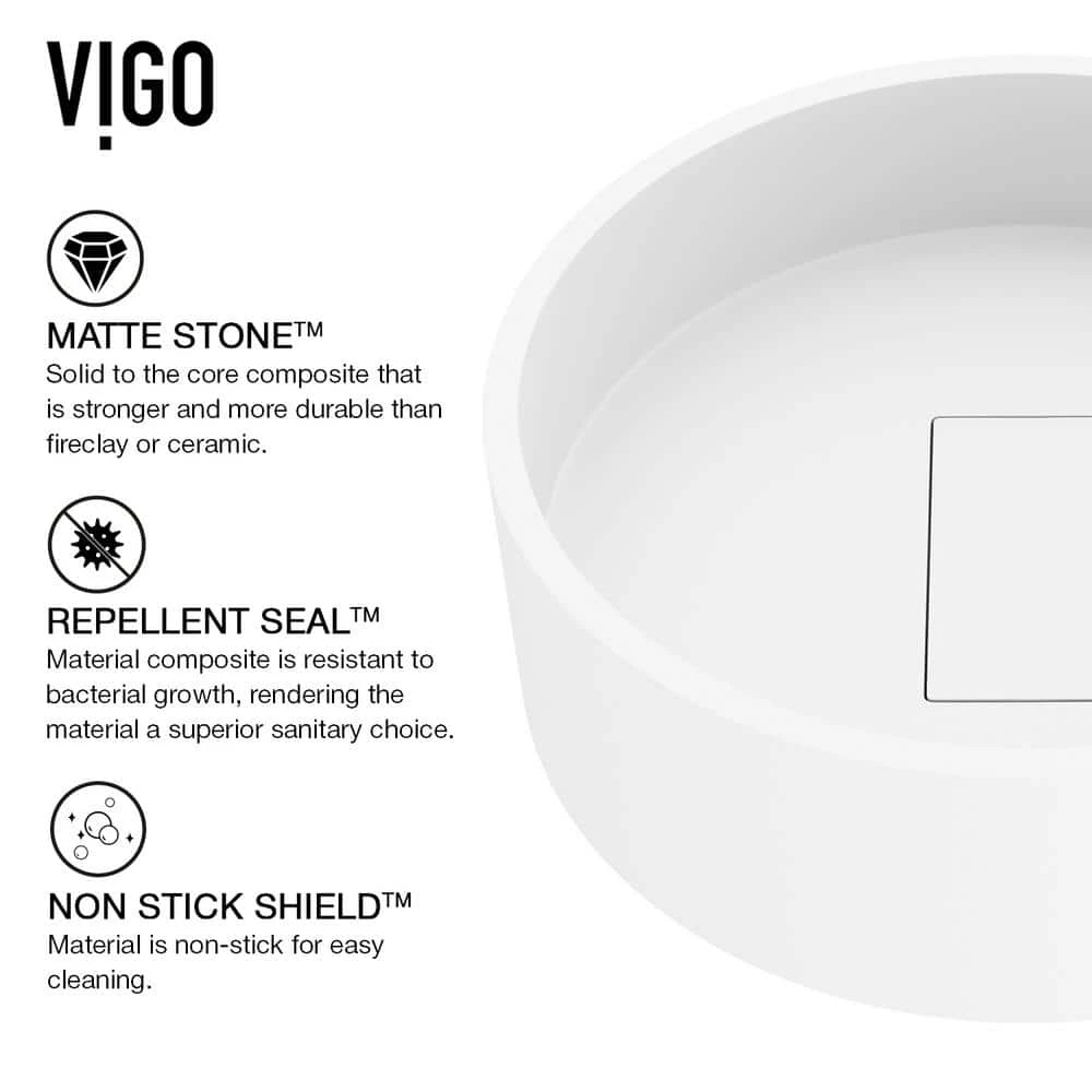 - MATTE STONE TM: VIGO’s proprietary solid core composite is smooth, non-porous and naturally hygienic that expertly resists scratches, fading, and impact