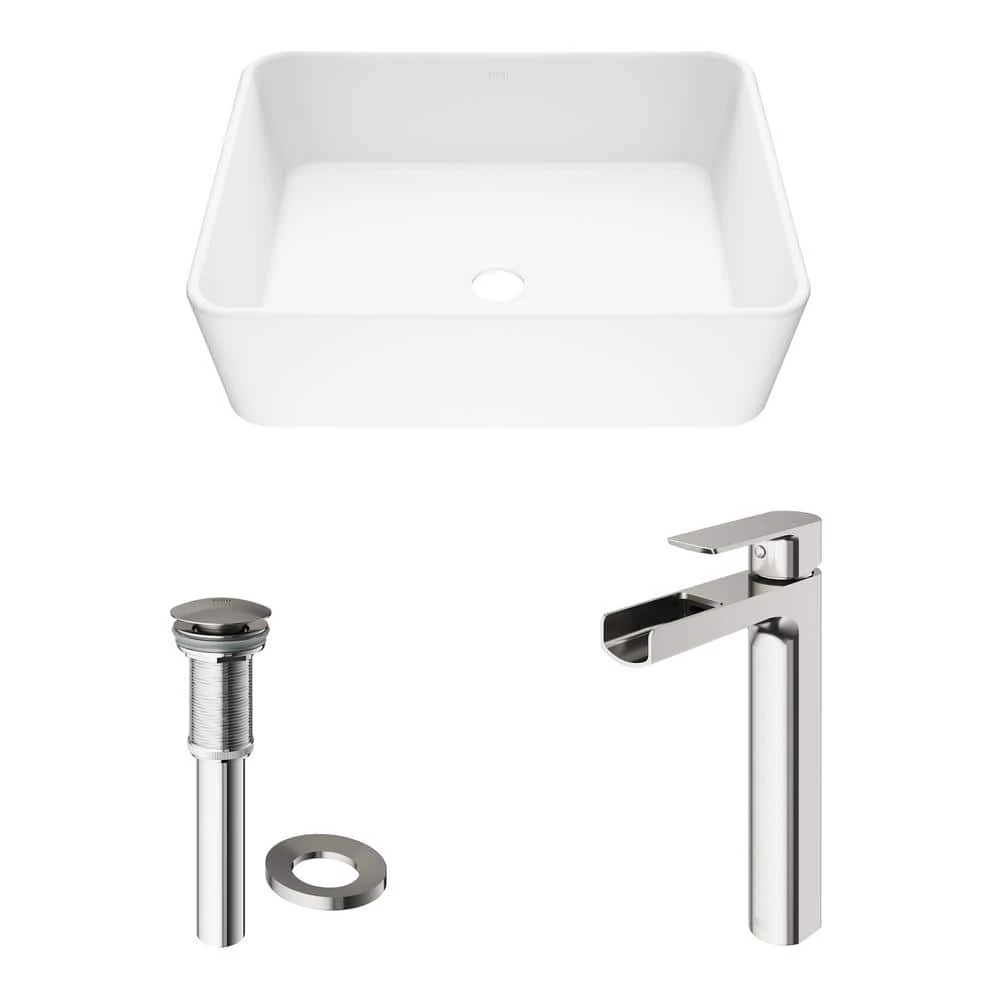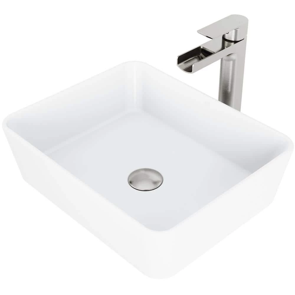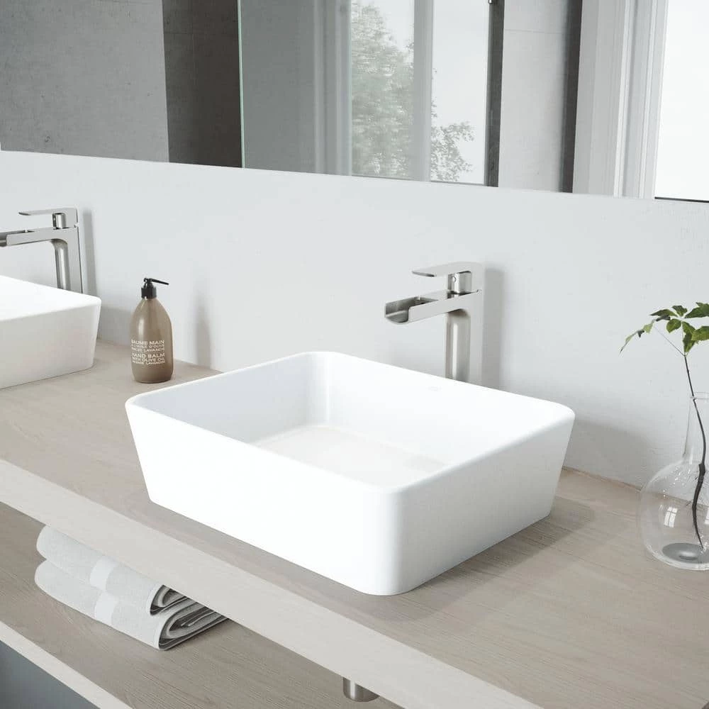 Make space for shapes with the VIGO Marigold Matte Stone Vessel Bathroom Sink Set with the Amada Vessel Bathroom Faucet. This geometrically-inclined duo perfectly pair a streamlined, rectangular Matte Stone sink with a sleek, trough-style faucet for effortless elegance. The sink’s rounded edges and the faucet’s mineral-resistant nozzle make the entire set easy to clean. A matching finish pop-up drain, inserted directly into the sink, completes this bathroom sink set.