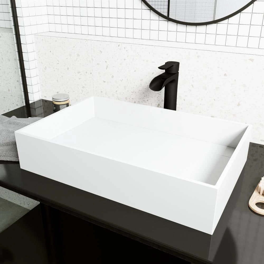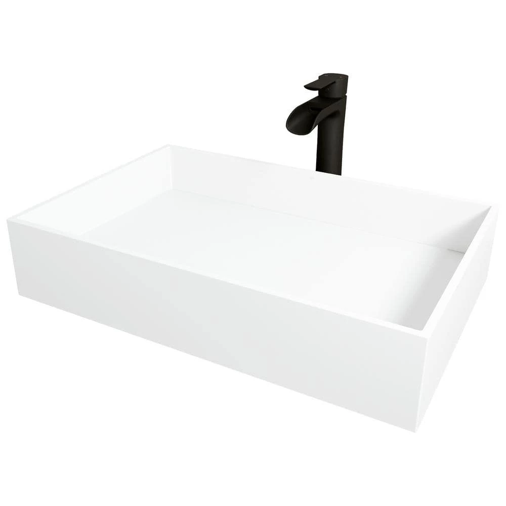 VIGO Matte Stone Montauk Composite Rectangular Vessel Bathroom Sink in White with Niko Faucet and Drain in Matte Black