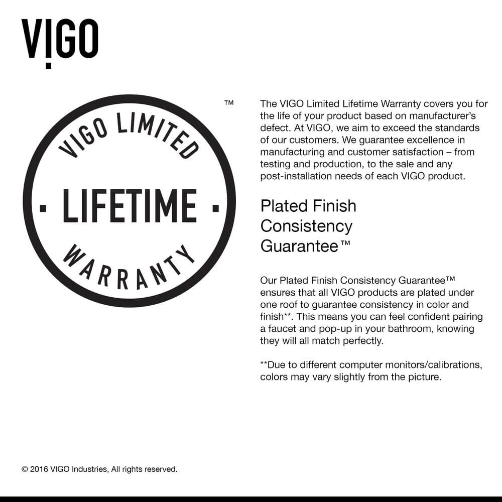 - QUALITY ASSURED WARRANTY: all VIGO bathroom sinks and faucet finishes feature an exceptional limited lifetime warranty