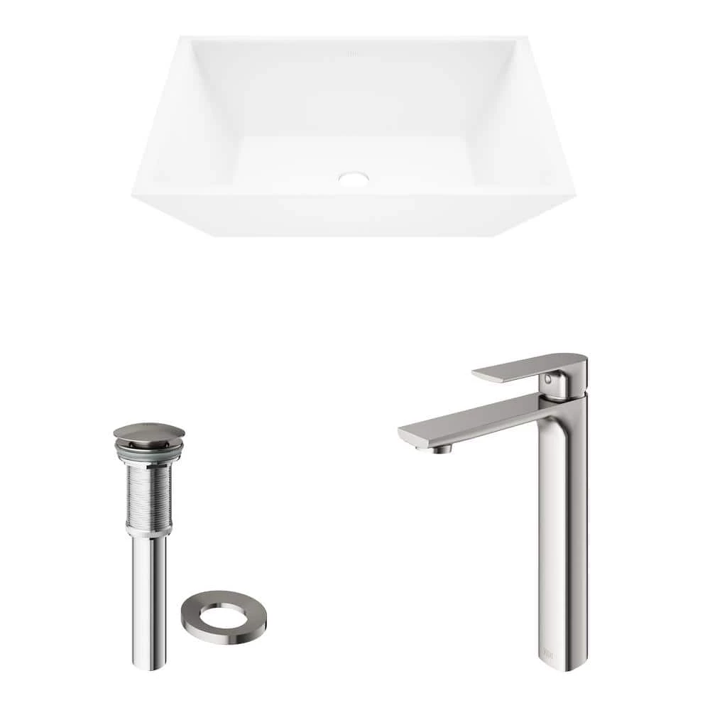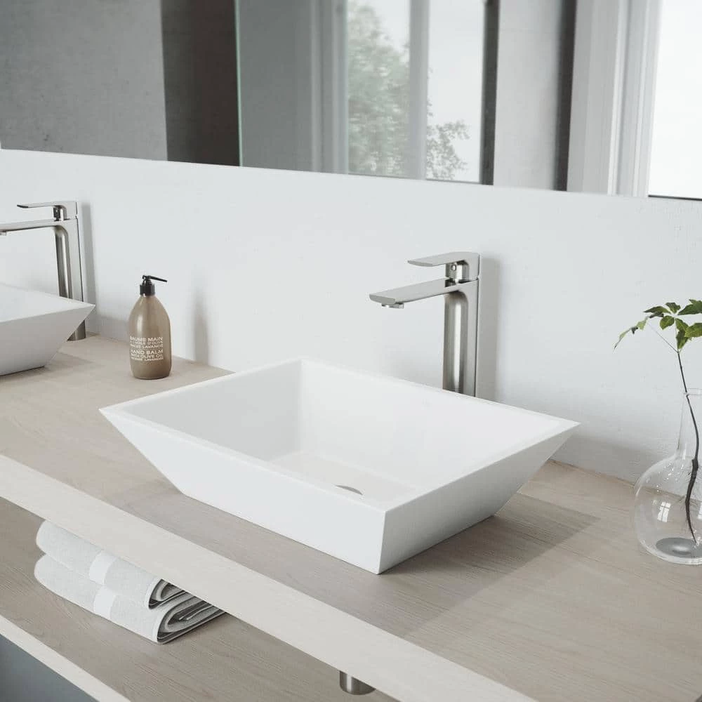 The shape may taper but the quality never diminishes with the VIGO Vinca Matte Stone Vessel Bathroom Sink Set with the Norfolk Faucet In Brushed Nickel. Designed both for aesthetic style and functional expertise this Matte Stone sink resists scratches, impact and discoloration. When paired with the 7-layer finished Norfolk Vessel Bathroom Faucet of which the construction is solid brass this sink’s quality is even more evident. A complementary pop-up drain completes this all-in-one bathroom sink set.