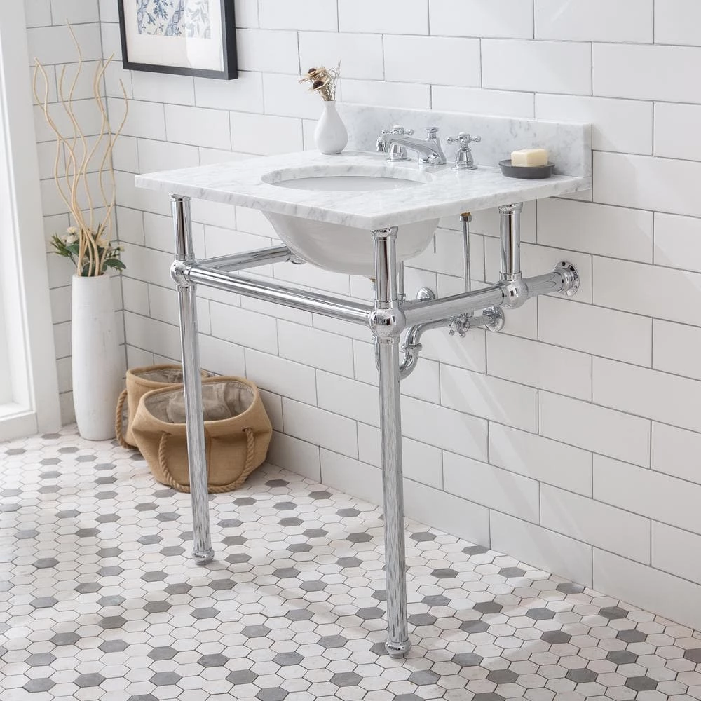 The compelling design of this Carrara white marble console sink with solid brass stand sparkles both contemporary and traditional thoughts suitable for any applications. A shiny bar across the front of deluxe, substantial brass legs not only improves stability but also provides a location from which is perfect for hanging towels and washcloths. This stand combines the multiple finishes of the metal structure to durable materials and compact dimensions, features that make it a great fit for a sophisticated bathroom.