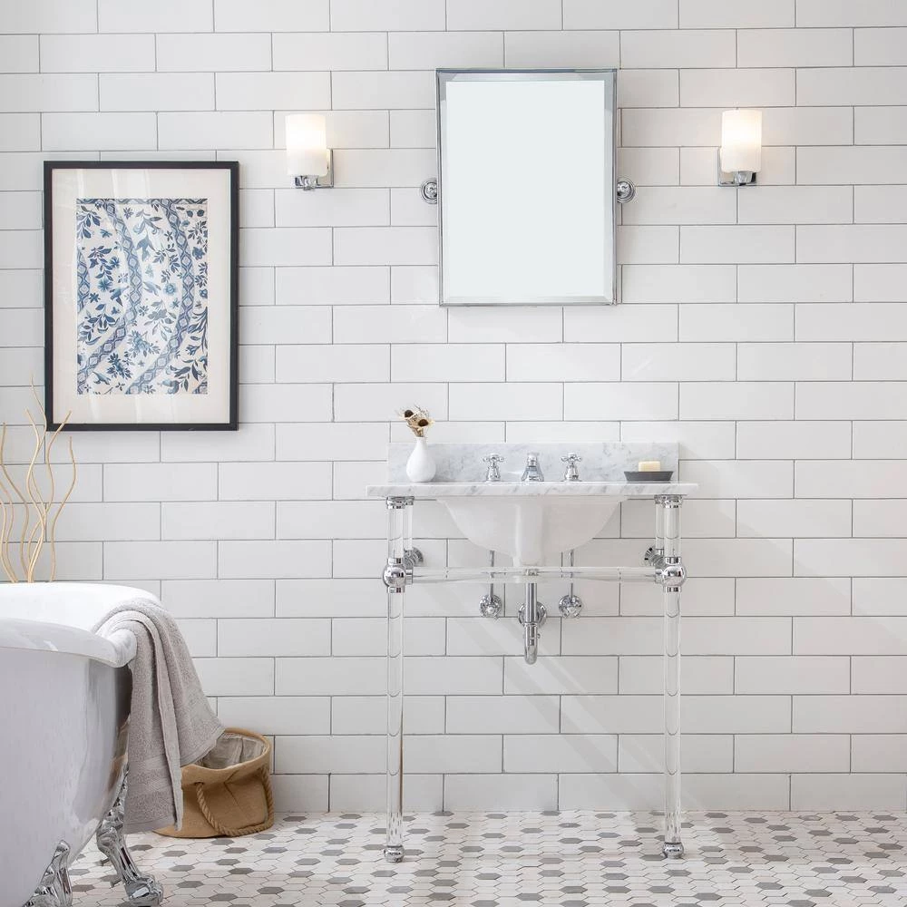 A classically inspired washbasin console, Empire Collection, enhances contemporary beautification into a sophisticated bathroom. Solid brass joints and acrylic stand melding for a cohesive whole, this Carrara white marble console sink with crystal clear acrylic stand is a perfect match for a miniature bathroom. An accessible bar across the front of deluxe, substantial acrylic legs not only improves stability but also provides a location from which is perfect for hanging towels and toiletries. Suitable for applications both contemporary and traditional, this artful design retains the harmony between proportions and its timeless charisma.