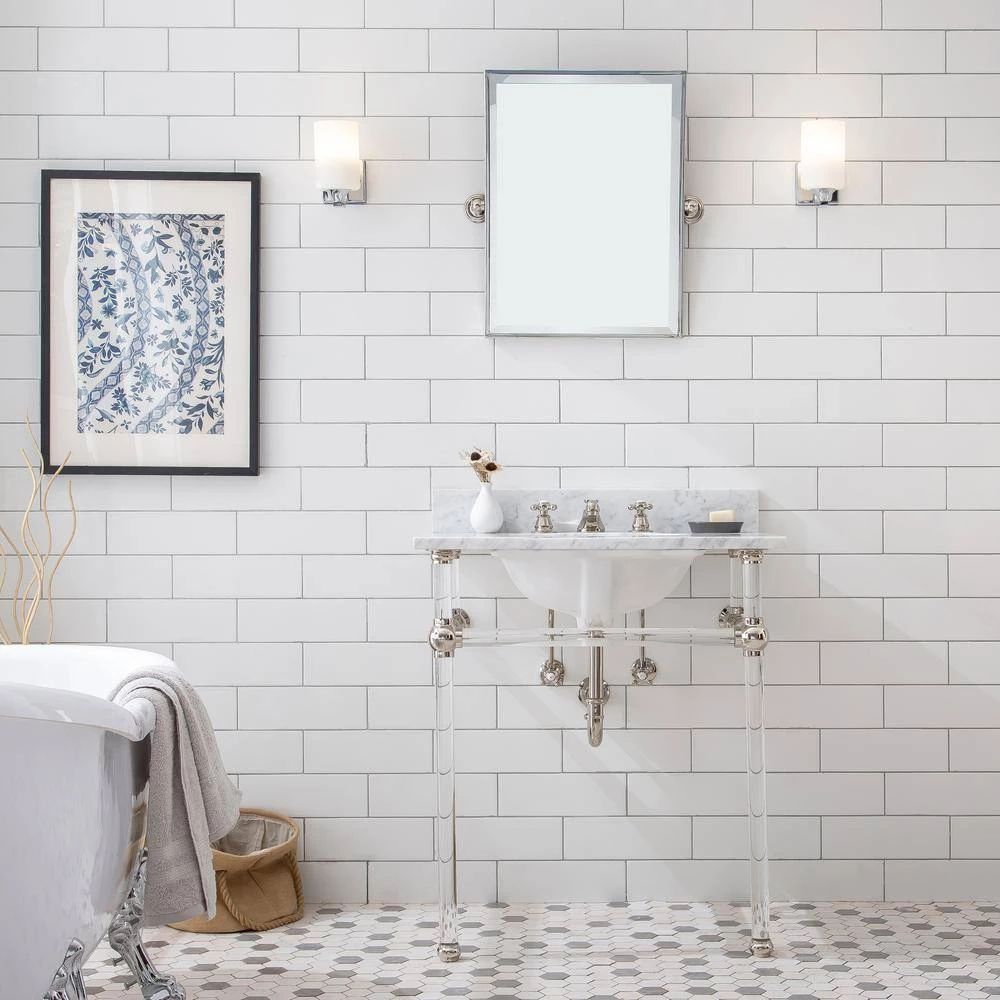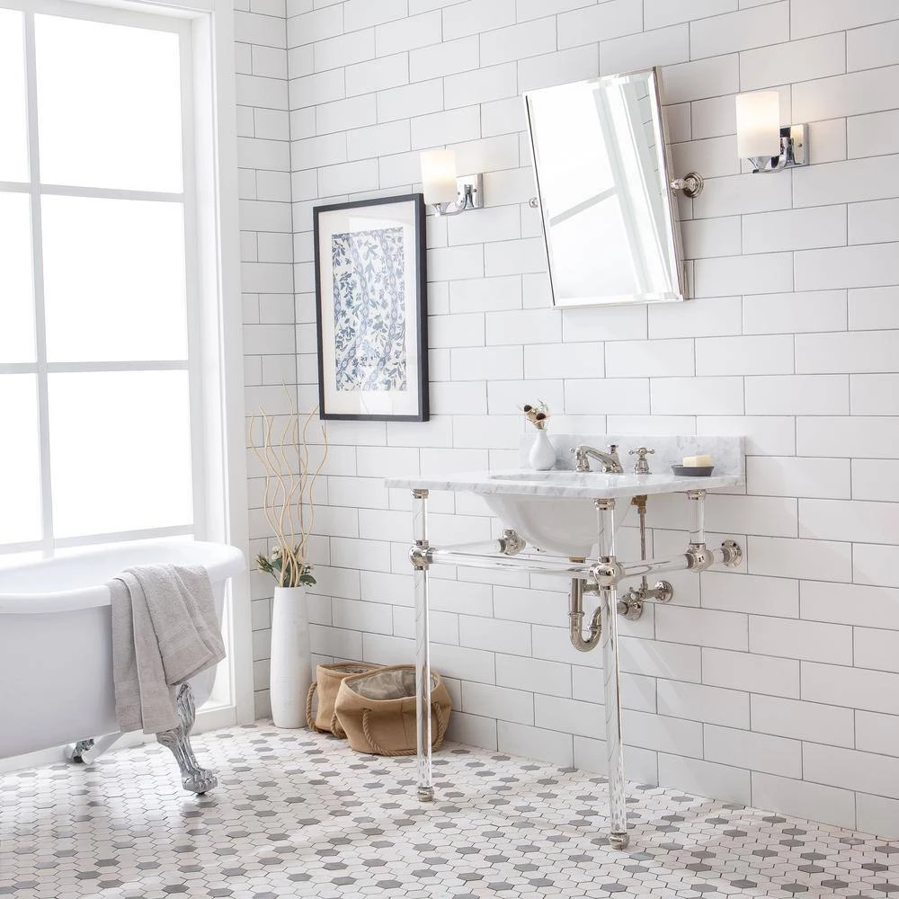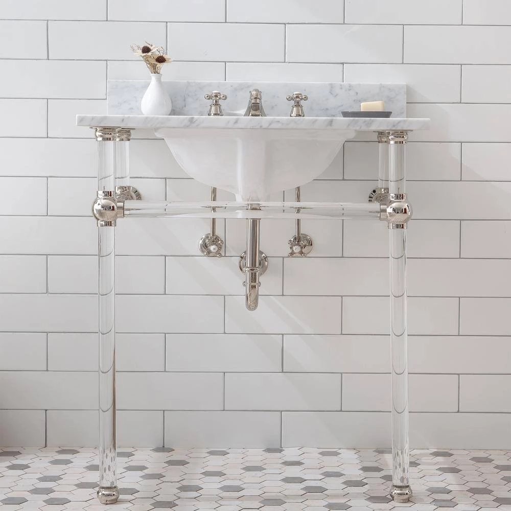 A classically inspired washbasin console, Empire Collection, enhances contemporary beautification into a sophisticated bathroom. Solid brass joints and acrylic stand melding for a cohesive whole, this Carrara white marble console sink with crystal clear acrylic stand is a perfect match for a miniature bathroom. An accessible bar across the front of deluxe, substantial acrylic legs not only improves stability but also provides a location from which is perfect for hanging towels and toiletries. Suitable for applications both contemporary and traditional, this artful design retains the harmony between proportions and its timeless charisma.